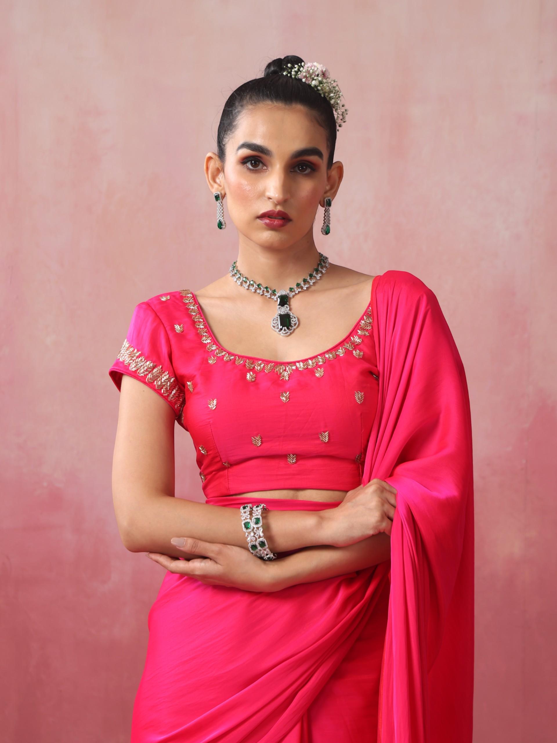 Fuchsia Satin Saree with Elegant Hand Embroidered Blouse Fabric