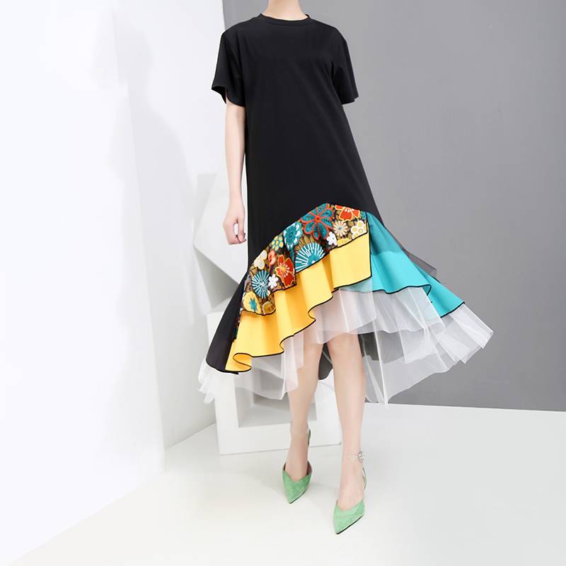 Material: Cotton Material: Rayon Material: Spandex Material: Mesh Silhouette: Straight Neckline: O-Neck Sleeve Length: SHORT Sleeve Style: Regular Decoration: Appliques Style: Casual Waistline: Natural Pattern Type: Print Dresses Length: Knee-Length