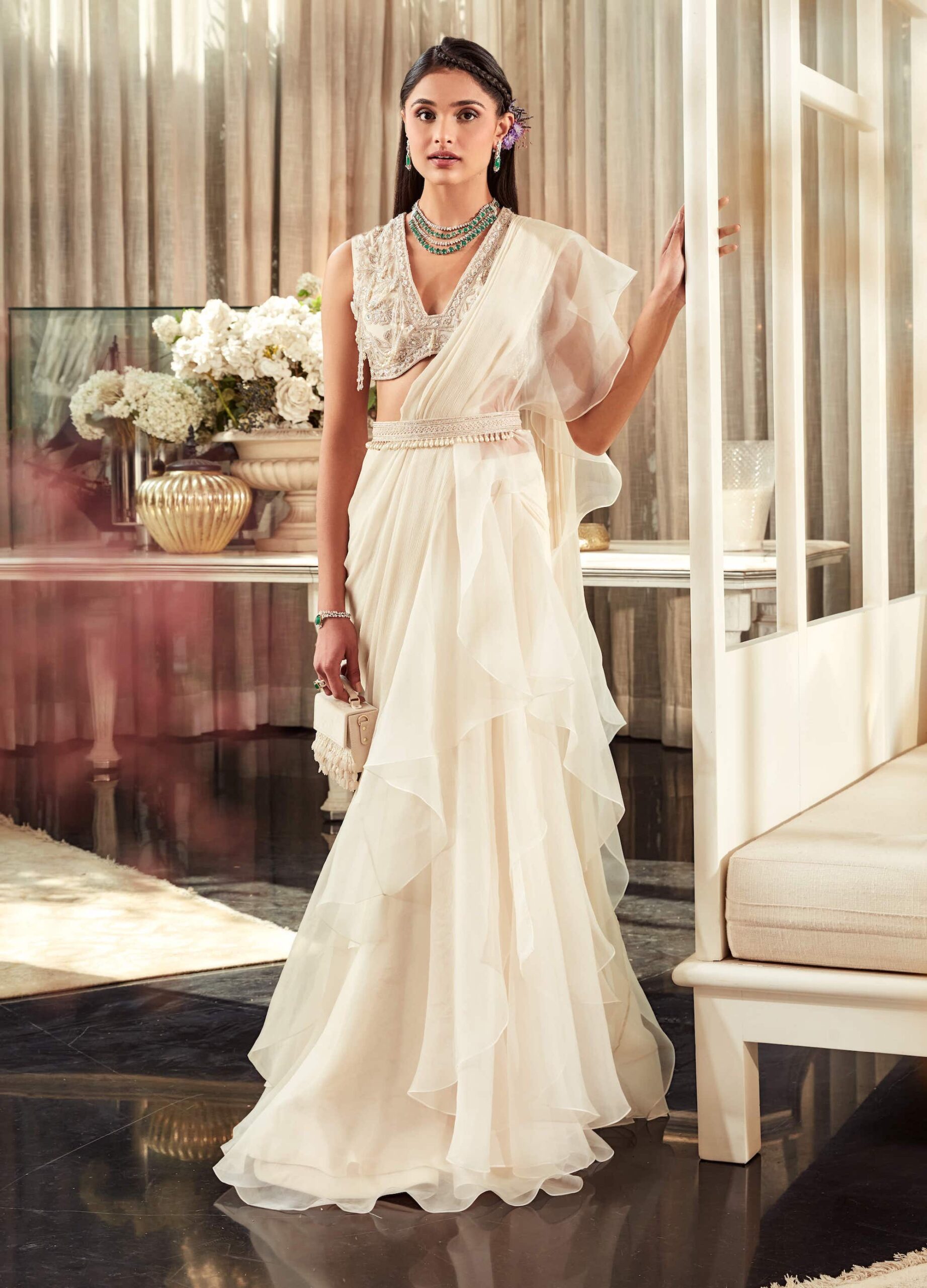 Ivory Draped Saree Set for Women Festive Wear