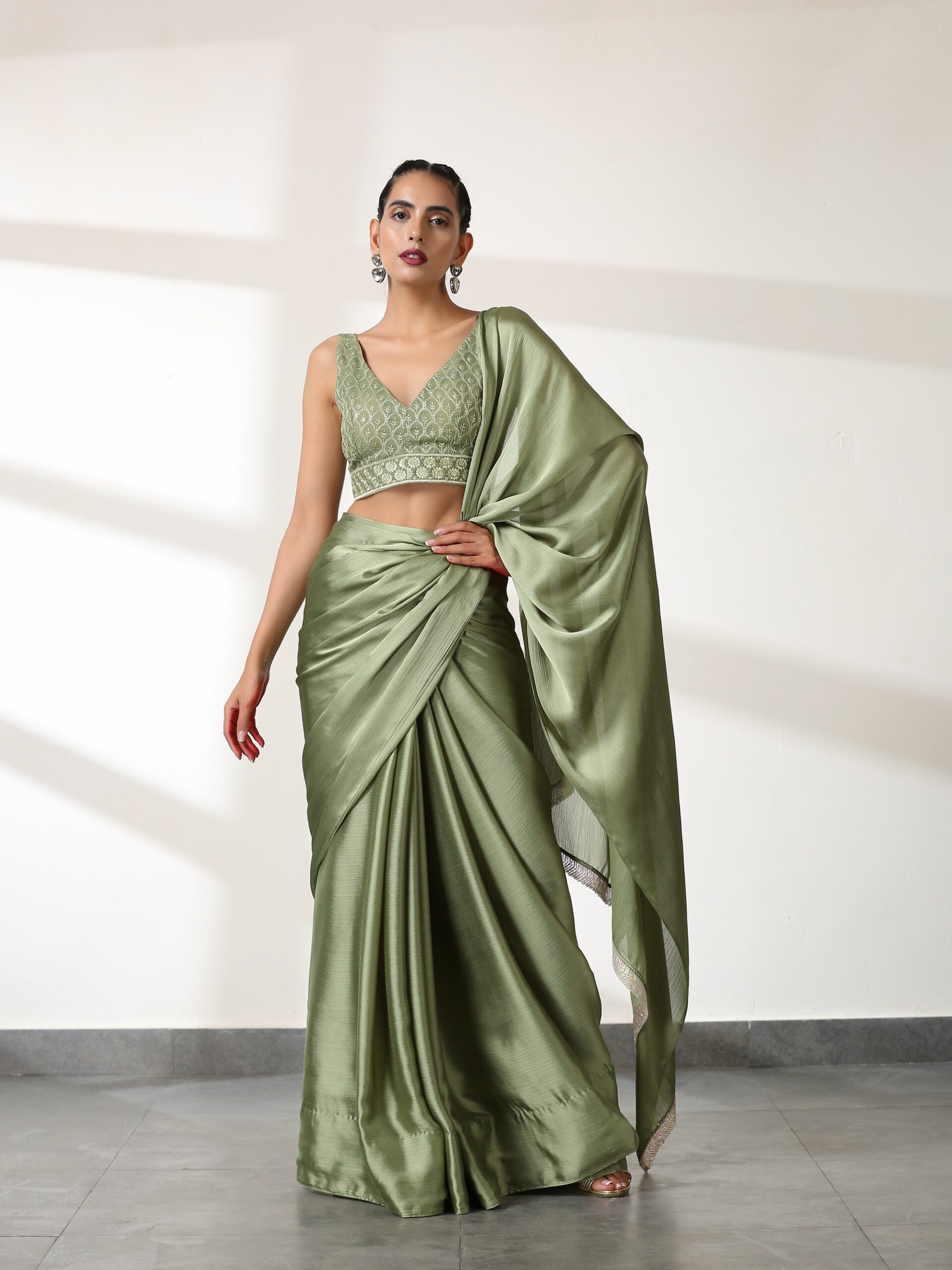 Home Saree Kiwi Green Butter Chiffon Saree with Embroidered Blouse