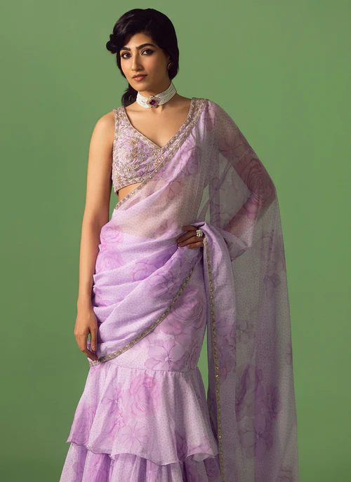 Lavender Floral Printed Organza Saree with Matching Blouse for Women