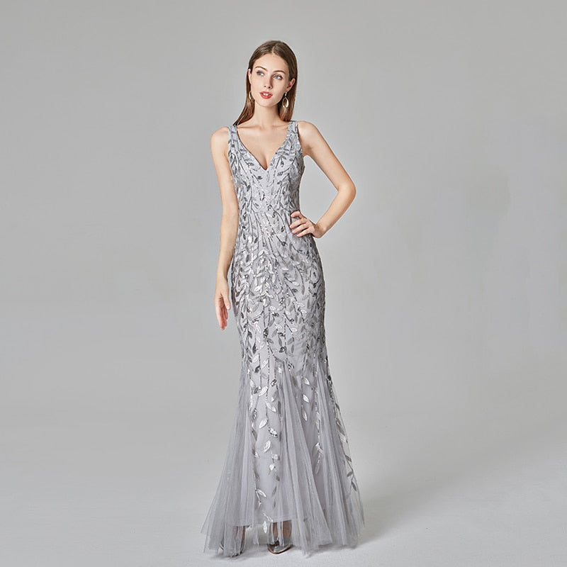 Sleeve Style: SleevelessSilhouette: MermaidPattern Type: FloralNeckline: V-NeckMaterial: PolyesterFabric Type: TulleDresses Length: Floor-LengthDecoration: Embroidery, Sequin
