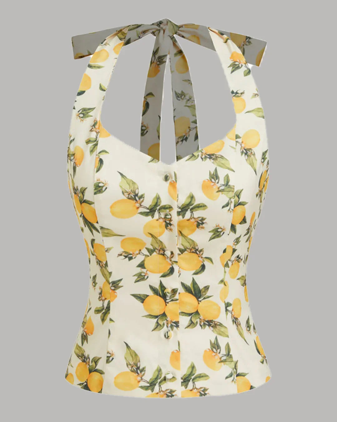 Lemon Print Ruched Halter Neck Fresh Summer Top