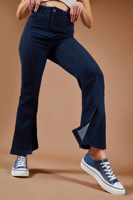 Navy Blue Bell Bottom Bootcut High Rise Stretch Denim Jeans with Slit Style