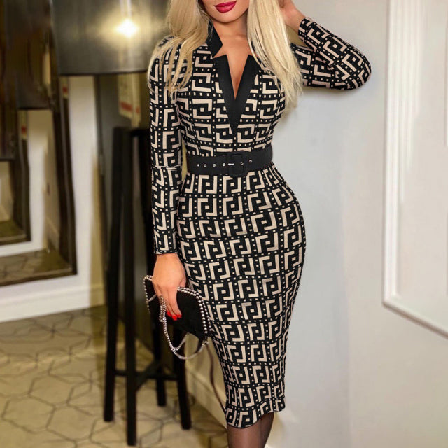 Silhouette: Sheath Neckline: V-Neck Sleeve Style: Regular Dresses Length: Mid-Calf Material: Polyester Closure Type: Pullover Sleeve Length: Full Pattern Type: Print