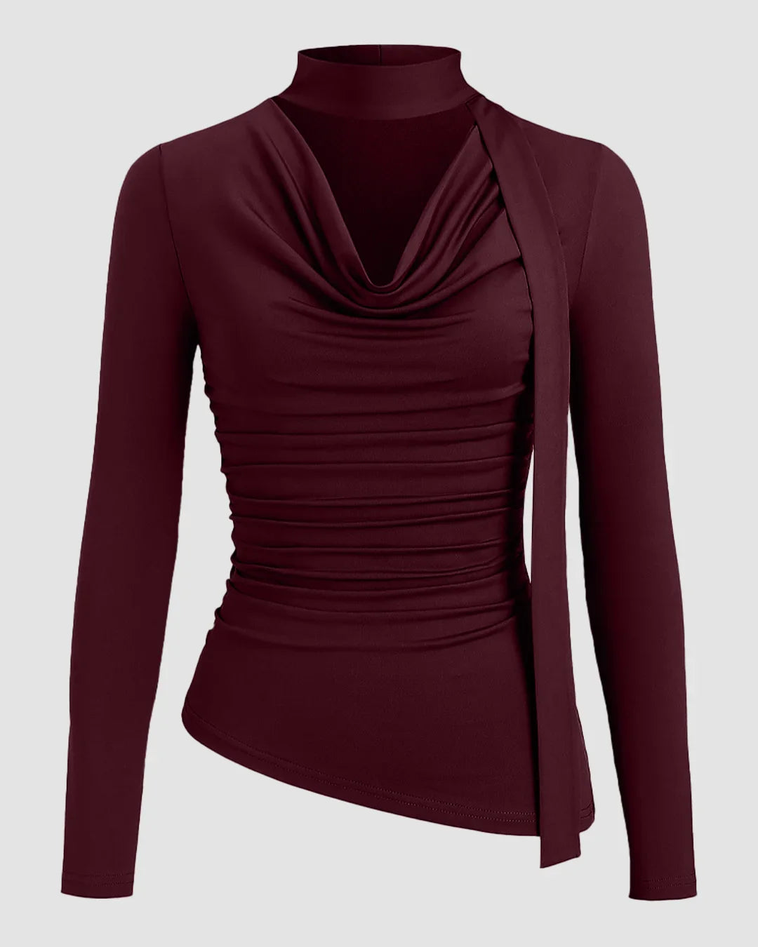 Home Tops Maroon Cowl Neck Ruched Full Sleeve Glam Top