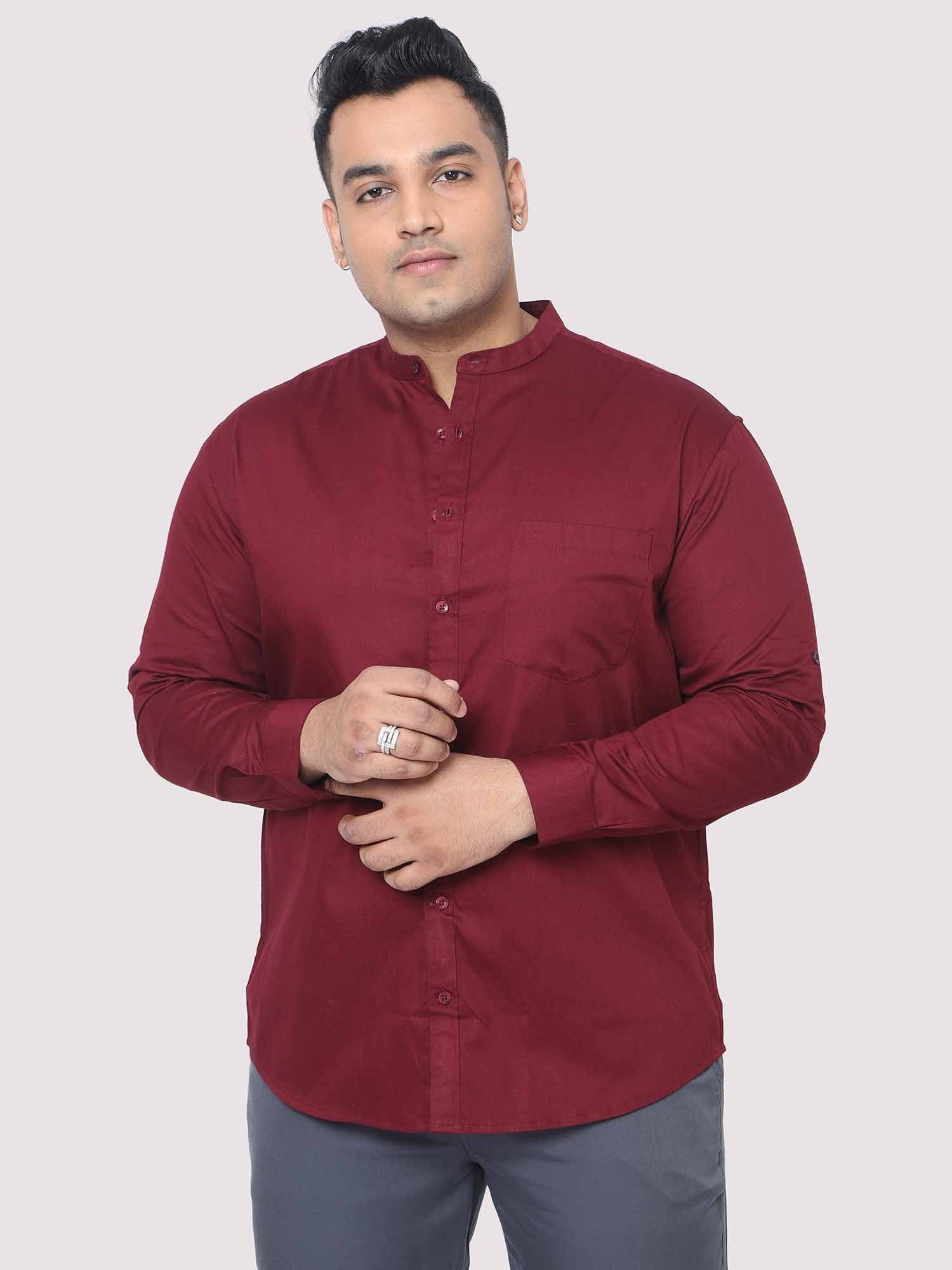 Maroon Mandarin Collar Men Plus Size Cotton Full Shirt