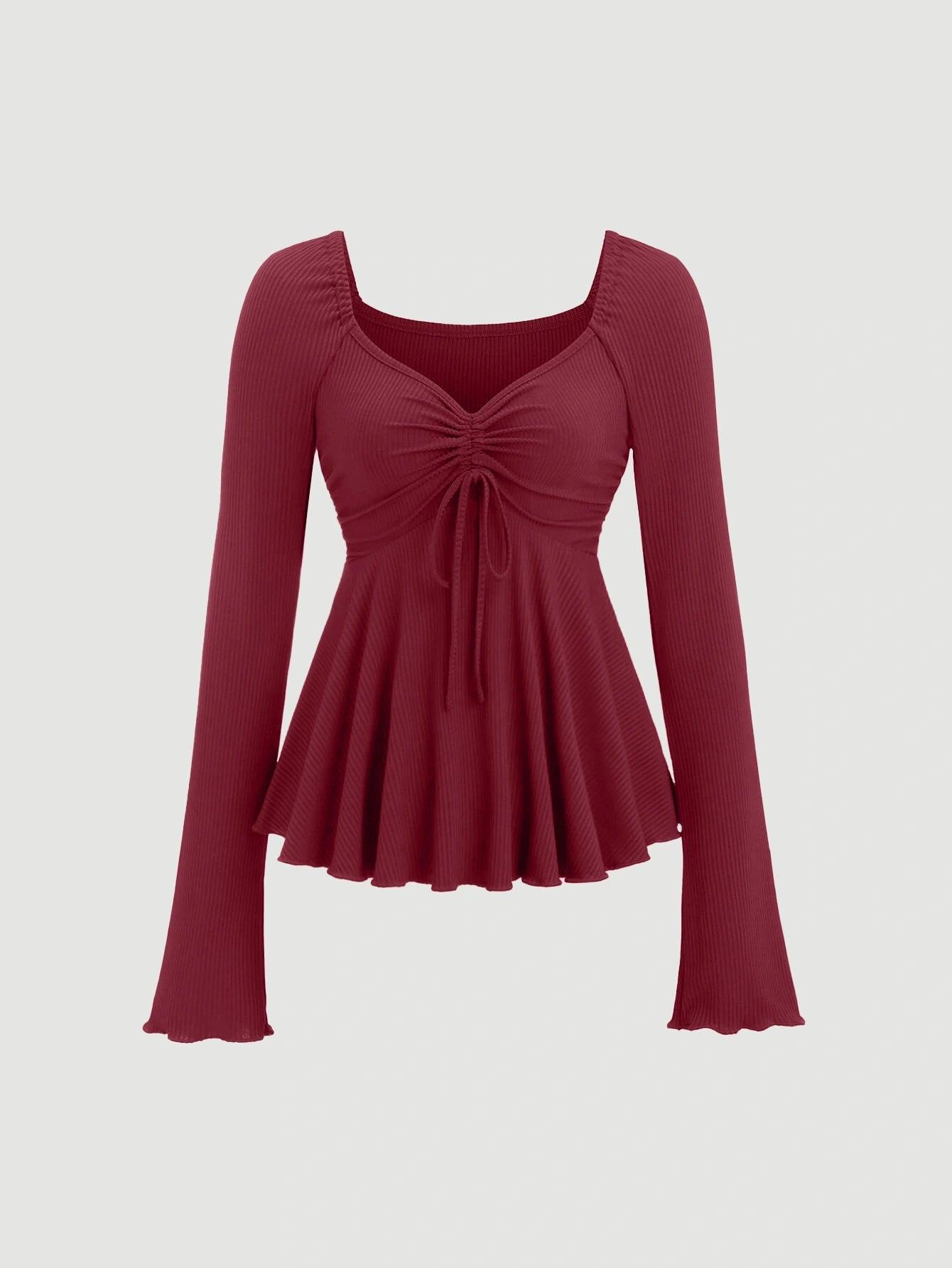 Maroon V-Neck Drawstring Long Sleeve Stylish Top