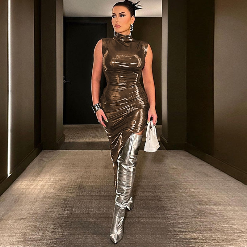 Sleeve Length: Sleeveless Silhouette: Asymmetrical Pattern Type: Solid Neckline: Turtleneck Material: Polyester, Leather Elasticity: High Stretch Dresses Length: Knee-Length Decoration: Draped Closure Type: Pullover