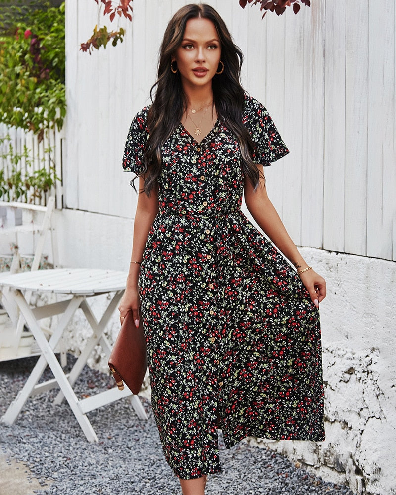 Sleeve Length: ShortSilhouette: A-LINEPattern Type: PrintedNeckline: V-NeckMaterial: Cotton, PolyesterDecoration: Button