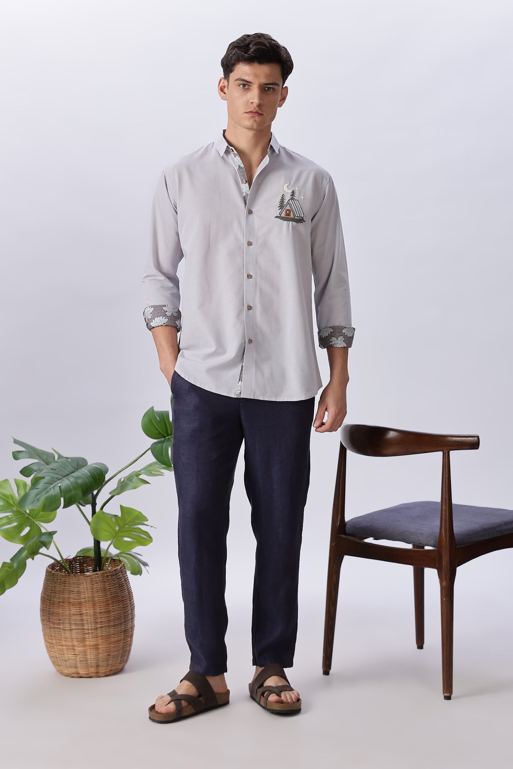 Grey cotton regular fit shirt with cabin-inspired embroidery. Designed for understated elegance in casual wear.