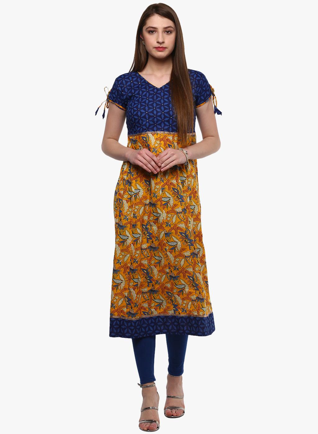 Get Gorgeous This Season With Blue And Mustard Anarkali, With Knots On The Sleeves And Sequins Work On The Front Yok.