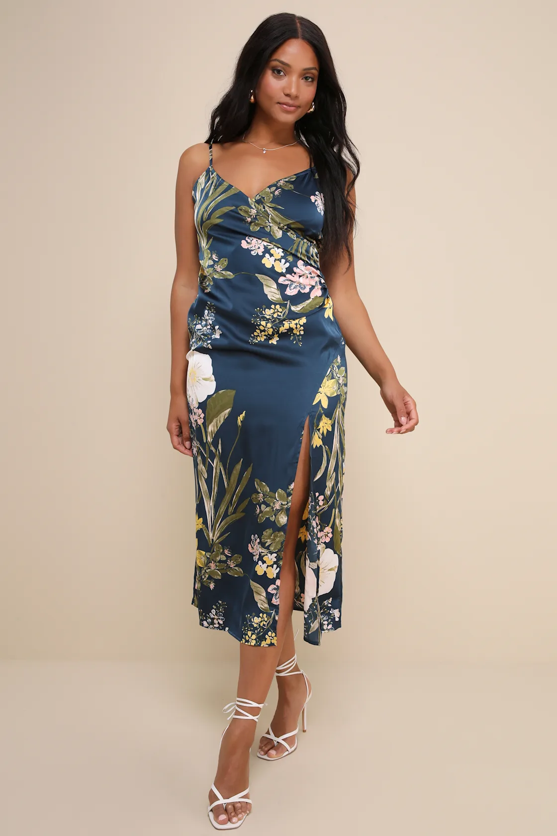 Make a graceful statement with this navy blue floral print satin midi dress, perfect for parties and special occasions. Crafted from premium satin fabric, this dress offers a smooth, lustrous finish and a flattering silhouette that enhances your style.