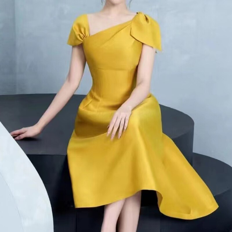 This dress is a must-have for your wardrobe. It’s a midi dress with a cotton material and short sleeves. The dress is an A-line and the color is yellow.
