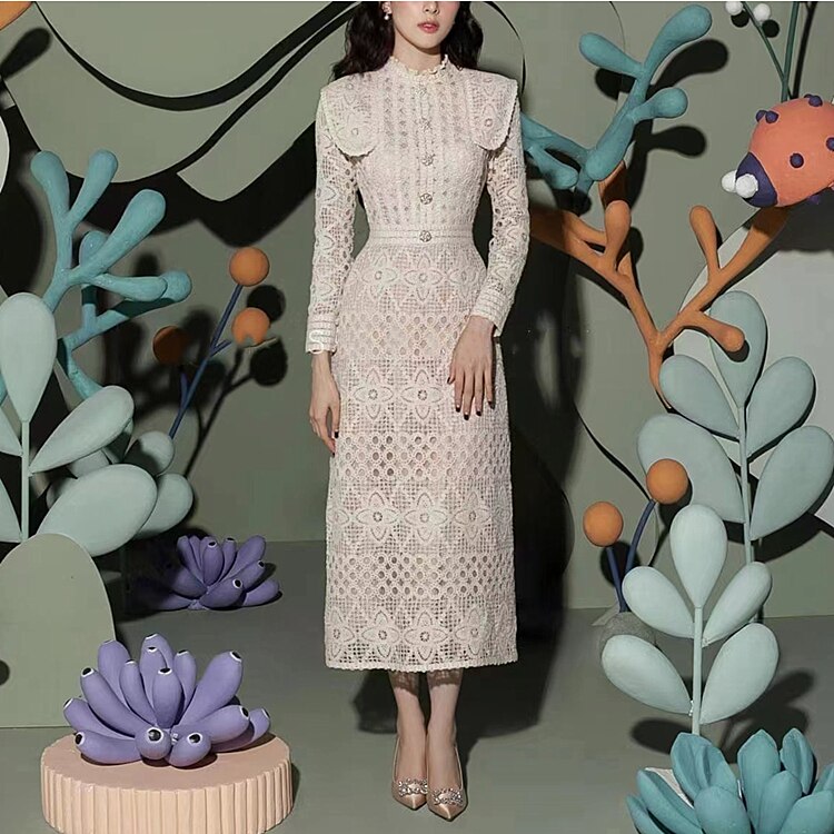 Waistline: NaturalSleeve Style: Cloak SleevesSleeve Length(cm): FullSilhouette: A-LinePattern Type: FloralNeckline: StandMaterial: Cotton, LaceFit Type: Regular FitFabric Type: LaceElasticity: Non-StretchLength: Mid-CalfClosure Type: Zipper