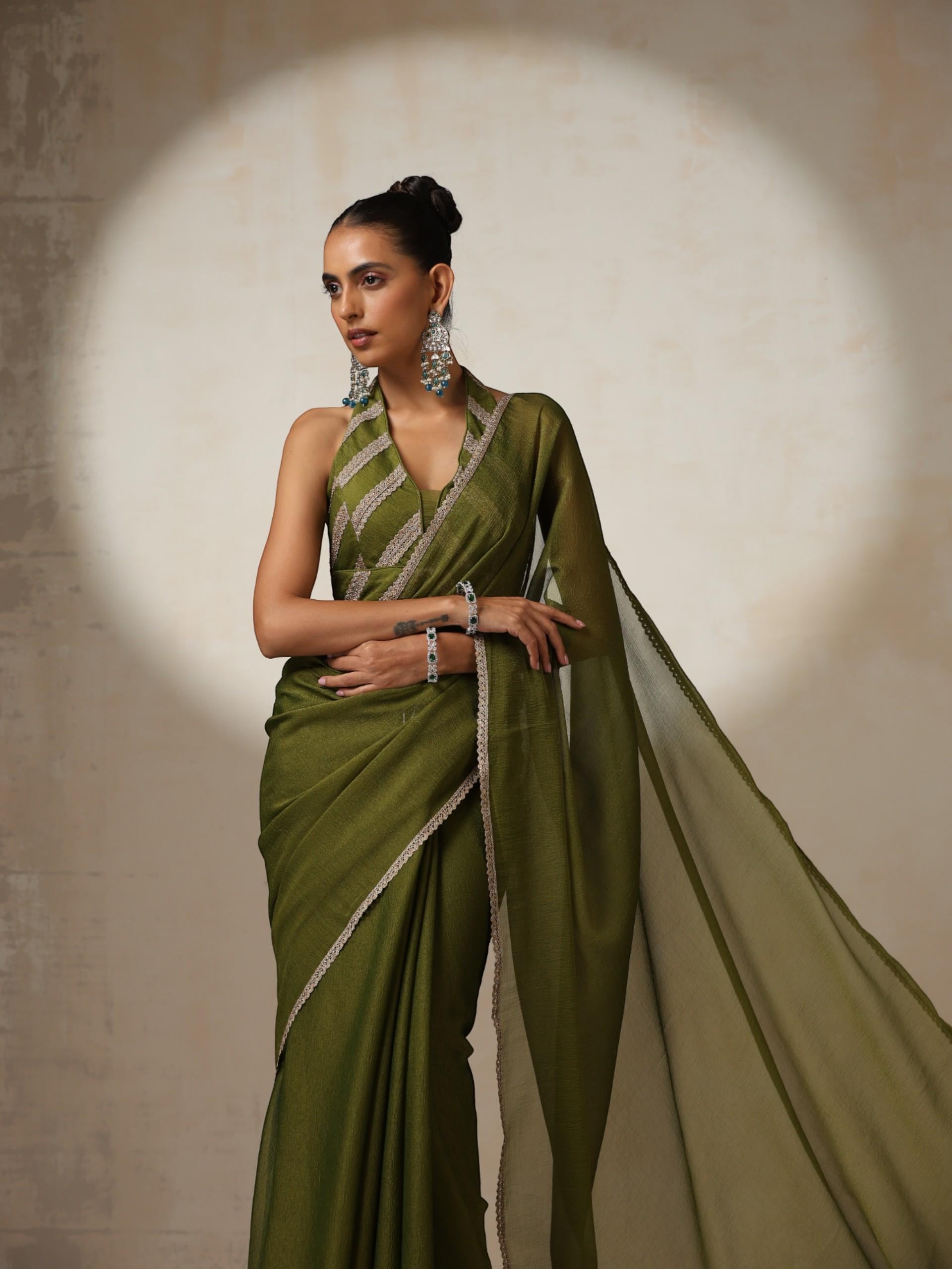 Olive Textured Chiffon Saree with Lace Detailing and Blouse Fabric