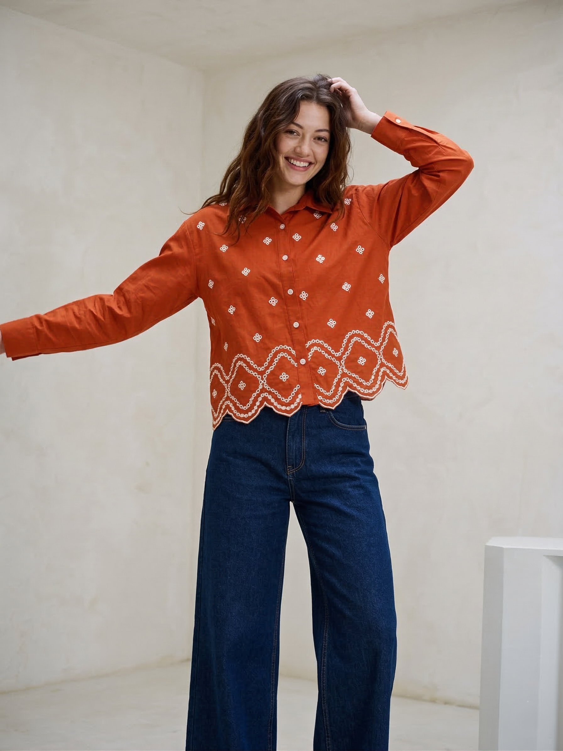 Women?s orange cotton embroidered shirt top, designed for both comfort and style. Made from soft breathable cotton fabric, this trendy shirt features elegant embroidery and a modern button-down design that gives it a smart casual look. Perfect for daily wear, office outfits, brunch, travel, and casual outings, this stylish women?s cotton shirt top blends fashion with comfort, making it a must-have western wear piece for every modern wardrobe.