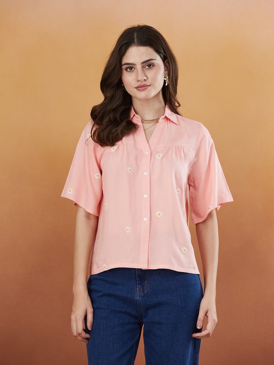 Home Women Shirt Peach Rayon Embroidered Oversized Shirt for Women