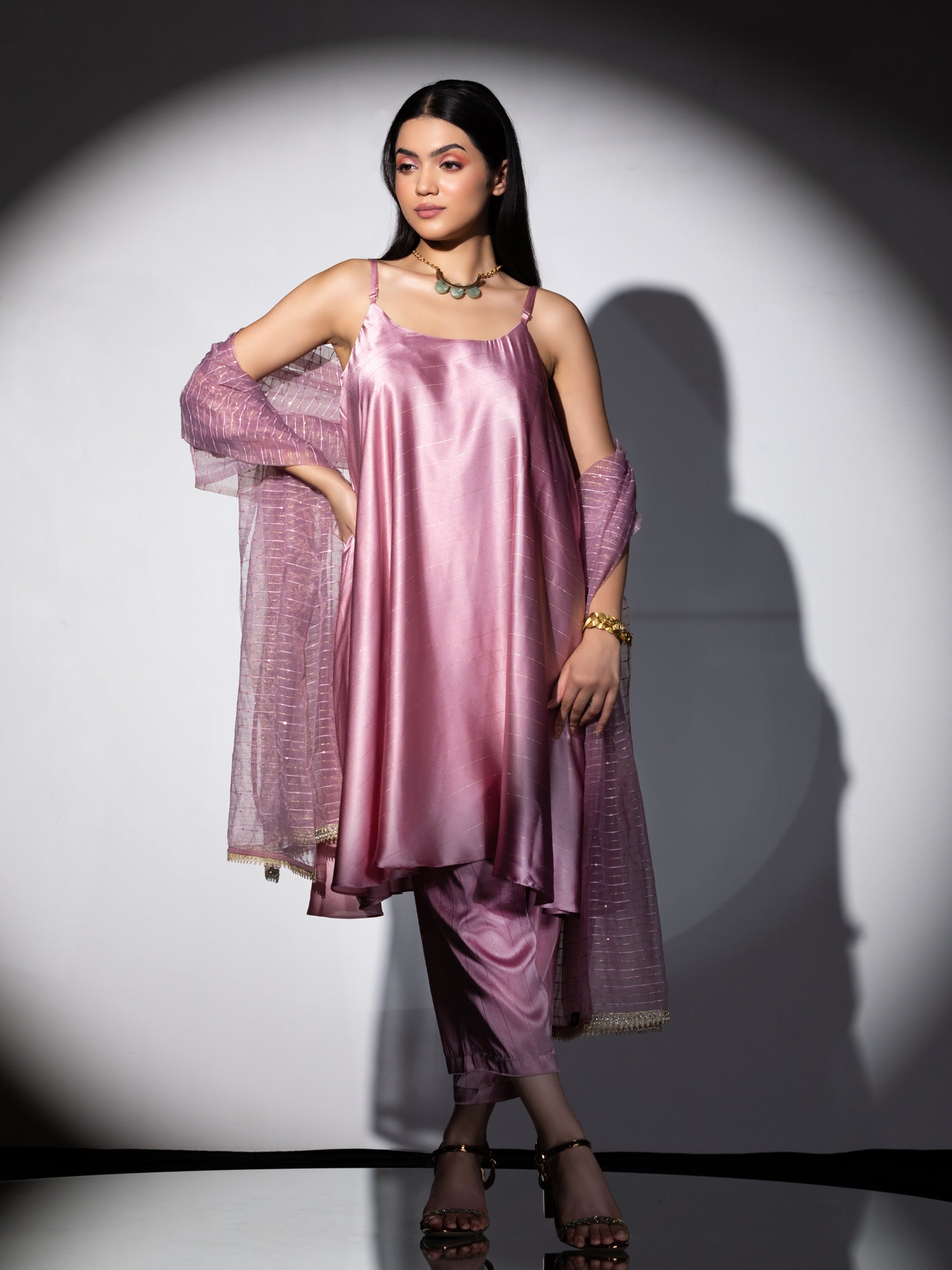 Pink Stripe Satin Dress Set with Sparkle Organza Dupatta