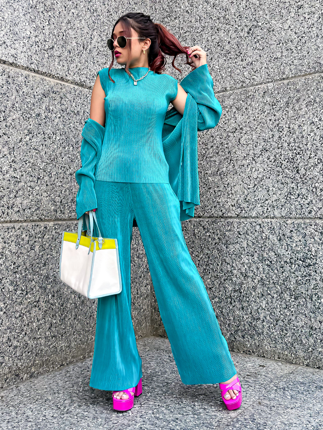 Type- Top Fabric-?Pleated Fabric? Fit- Regular Print- Solid Neck-?Slight High Neck Sleeve-?Short Sleeves
