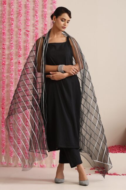 Black Strappy Cotton Kurta Set with Silver Net Dupatta for Festive Wear