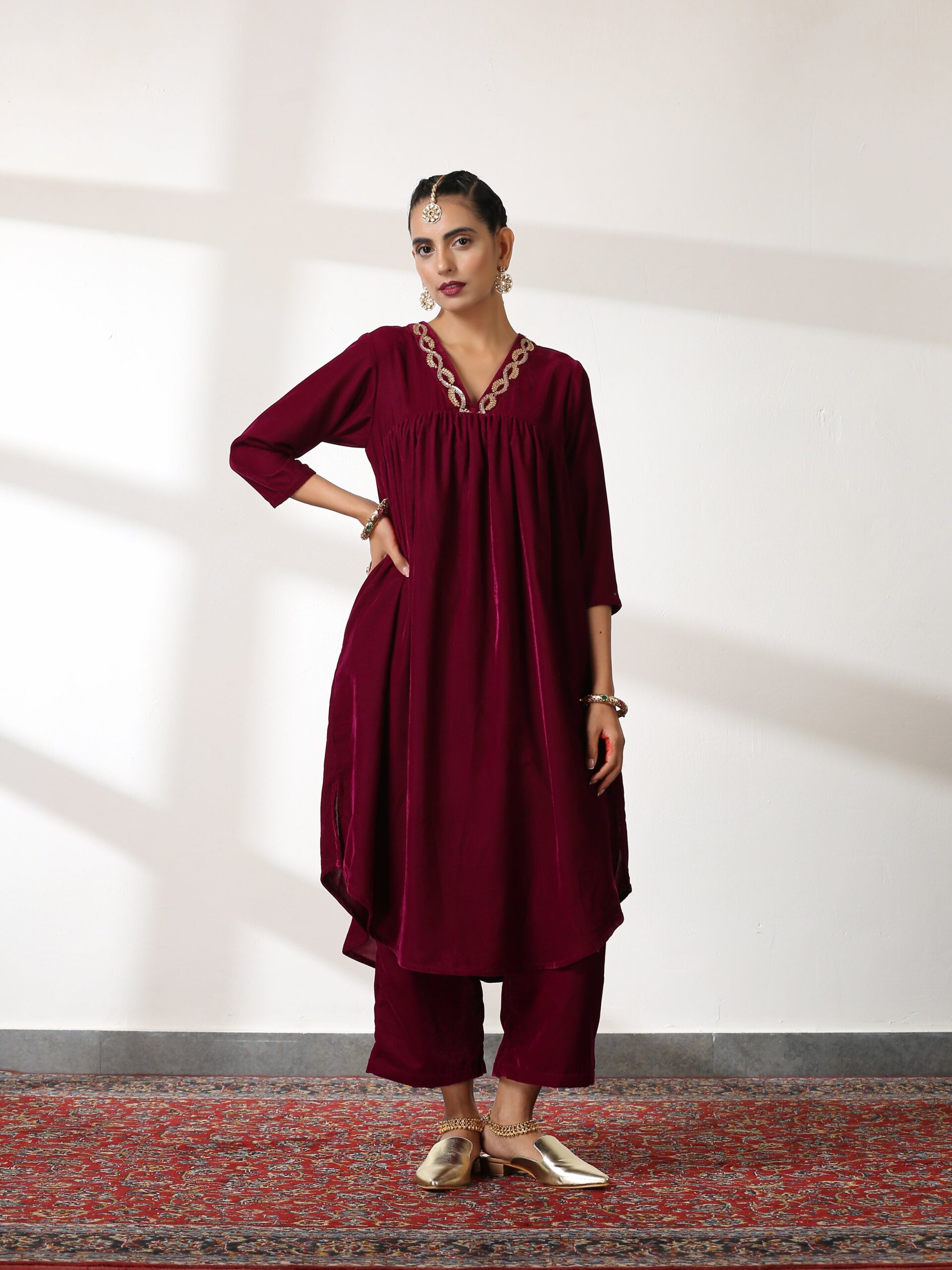 Plum Velvet Kurta Set with Sequinned Neckline,”A plush plum velvet kurta set enhanced with a sequinned neckline and matching pants for winter festivities.”