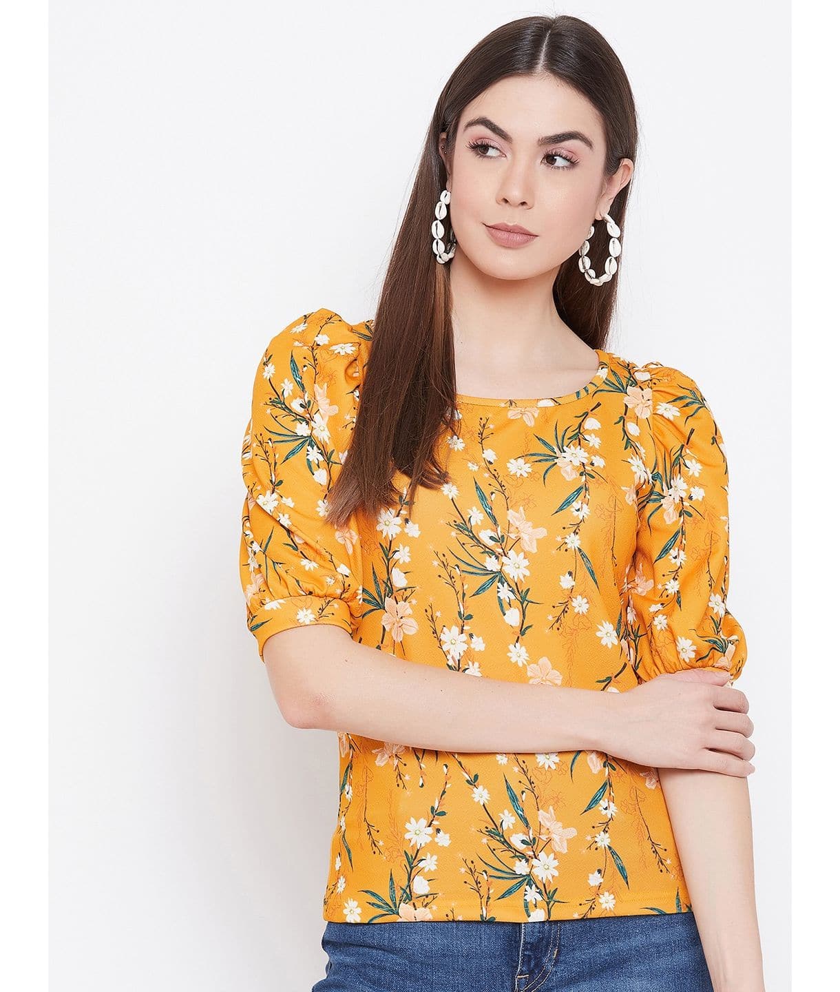Plus Size Cotton Floral Stretchable Puff Sleeve Top for Women Casual Wear