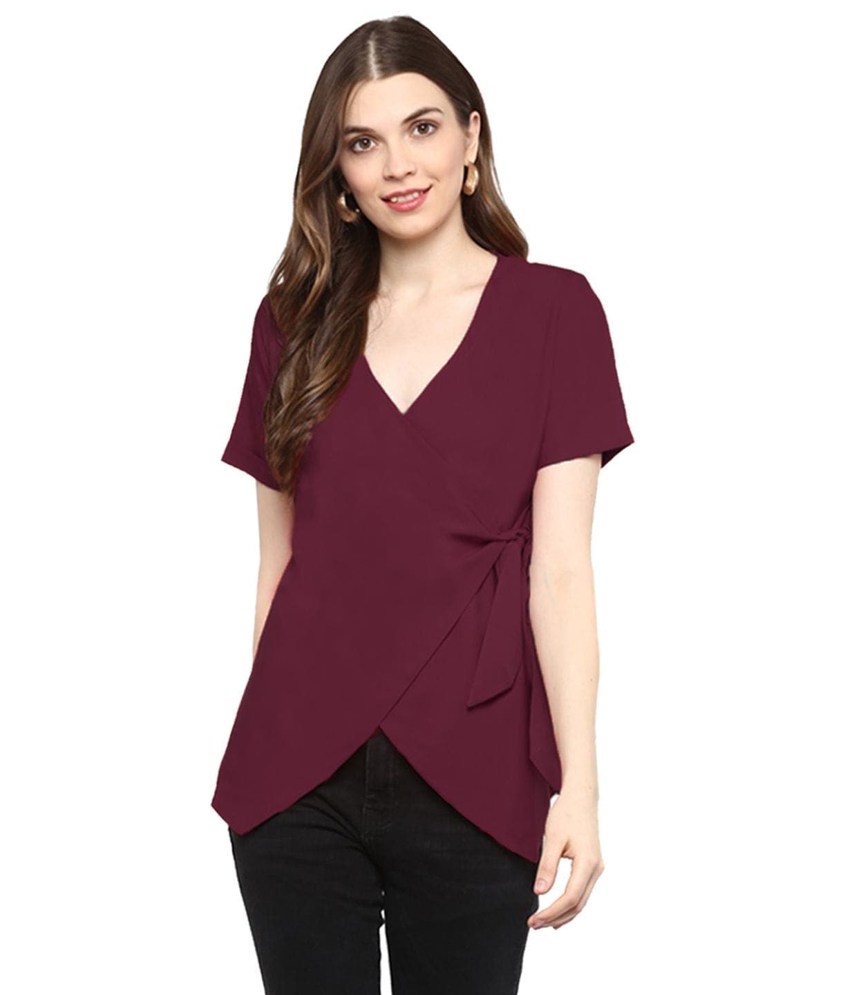 Home Tops Plus Size Maroon Solid Crepe Wrap Top for Women Party Wear
