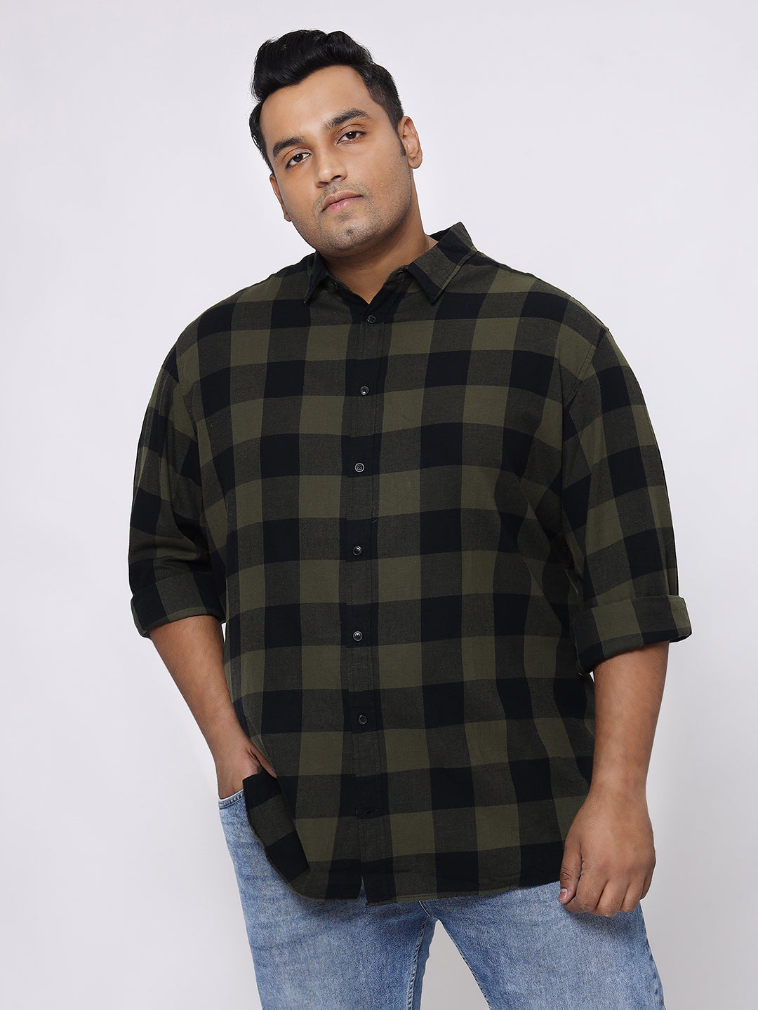 Plus Size Men Regular Fit Green and Black Checked Cotton Shirt