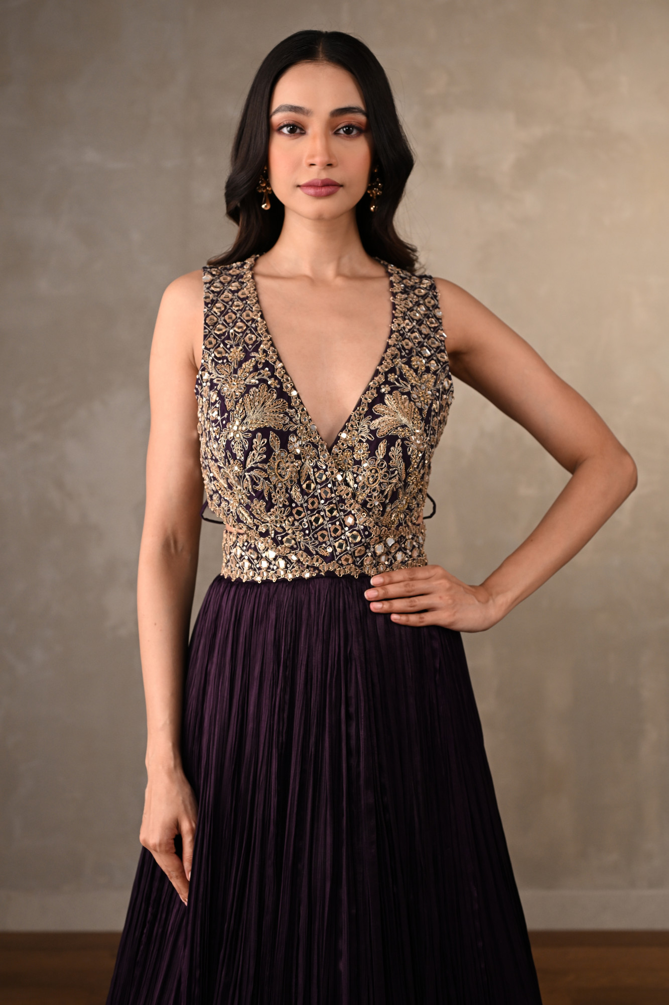 Make a statement in this purple gown featuring a plunging neckline and intricate mirror and thread embroidery. The pleated skirt adds graceful movement, while the open back cut-out detail brings a modern twist. Perfect for evening soirées and festive celebrations.