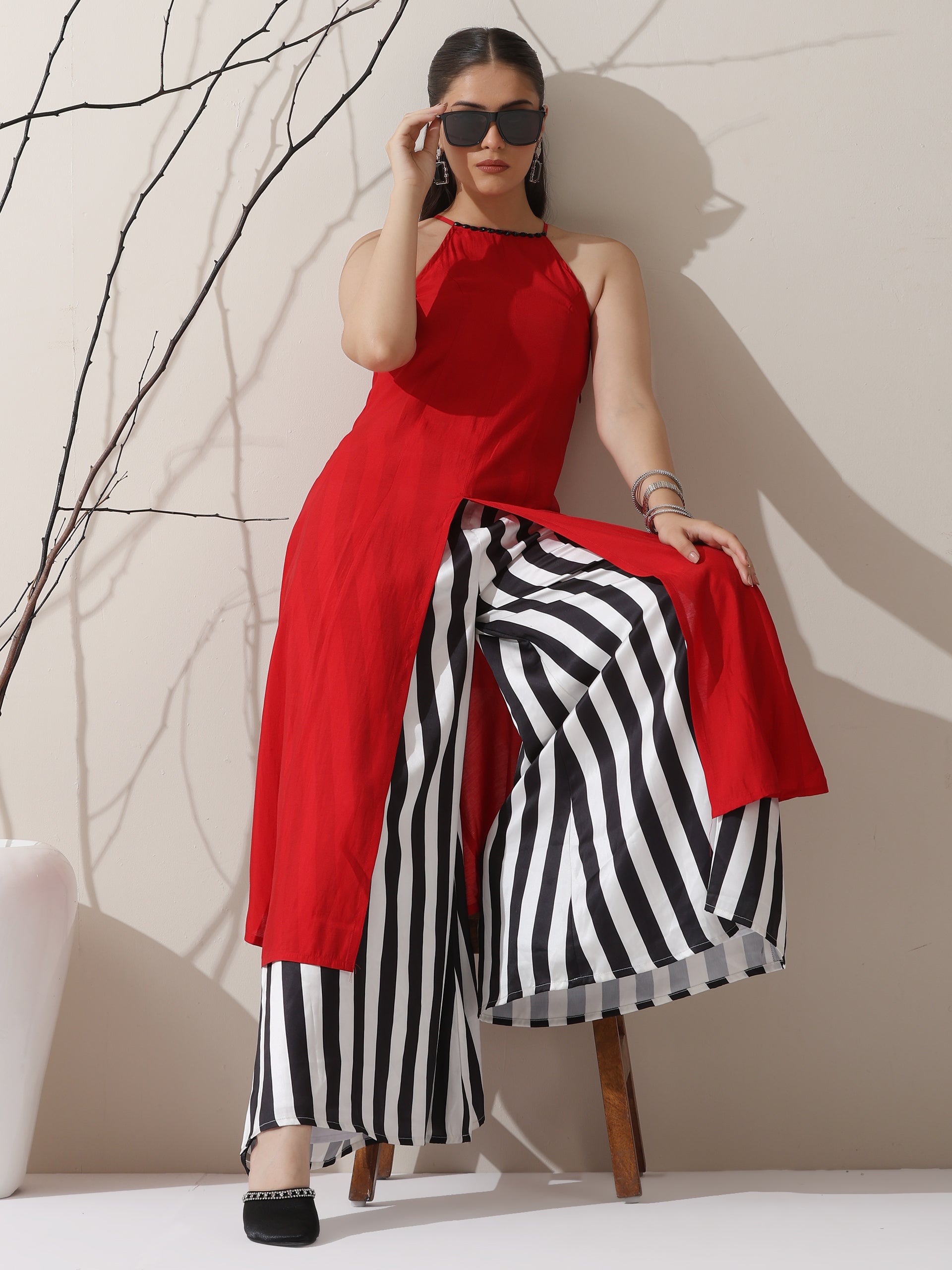 Red AirSkin Halter Top Set,”A red AirSkin halter top set styled with black beads and printed palazzo.”