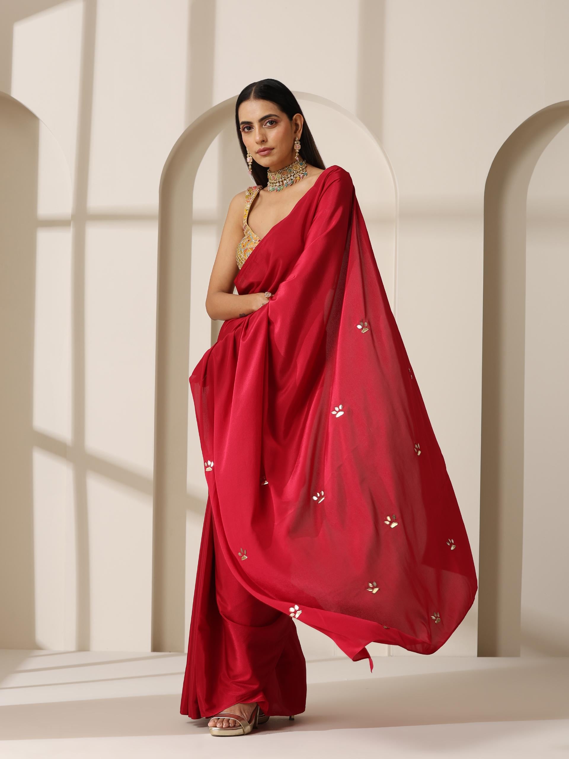 Red Crepe Saree with Beaded Pallu Styling