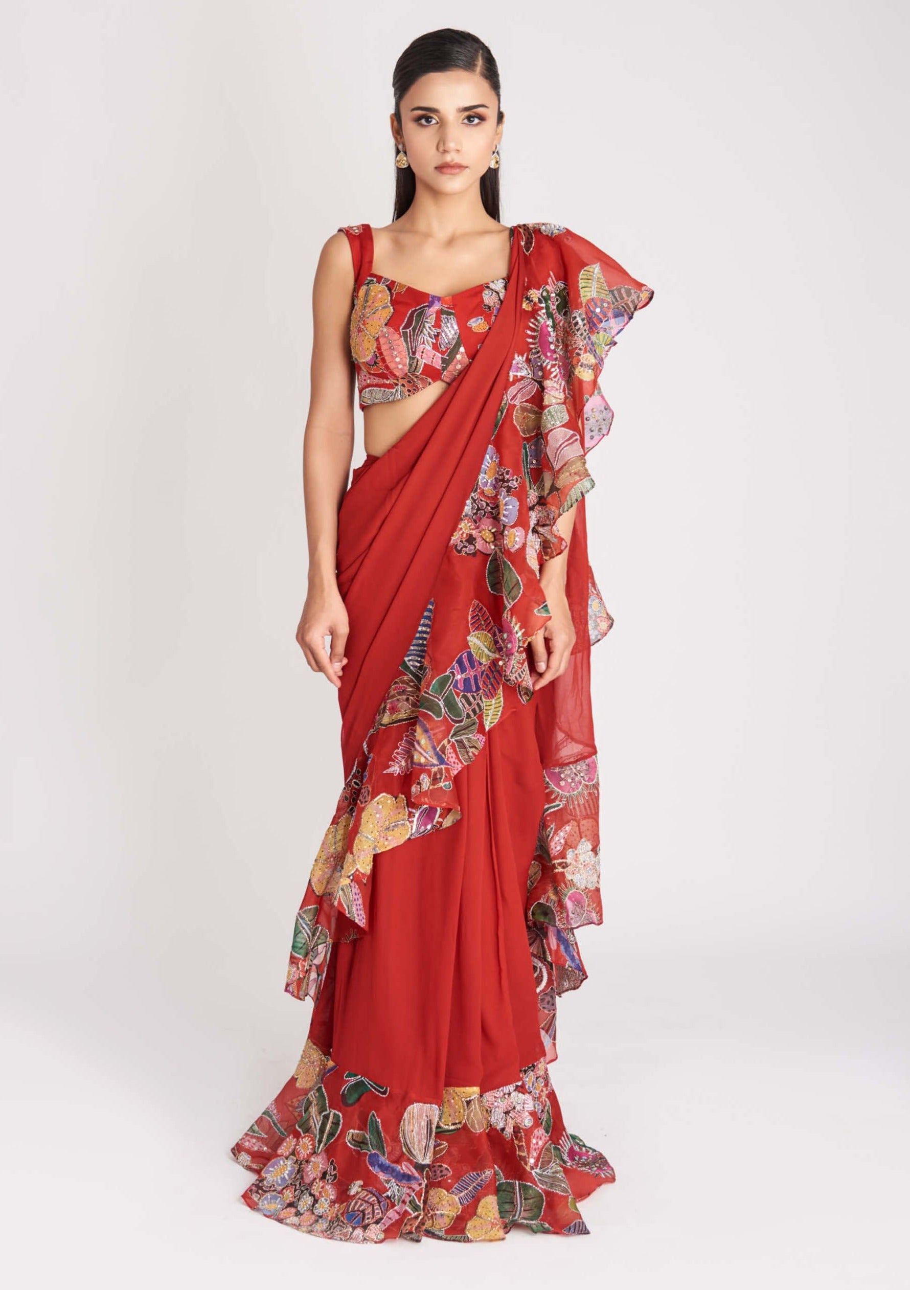 Indulge in opulent elegance with our fiery?red printed embellished organza ruffle Saree, paired with a georgette stitched?Saree and an organza blouse. This ensemble exudes timeless charm and sophistication, making it a perfect choice for special occasions and celebrations.