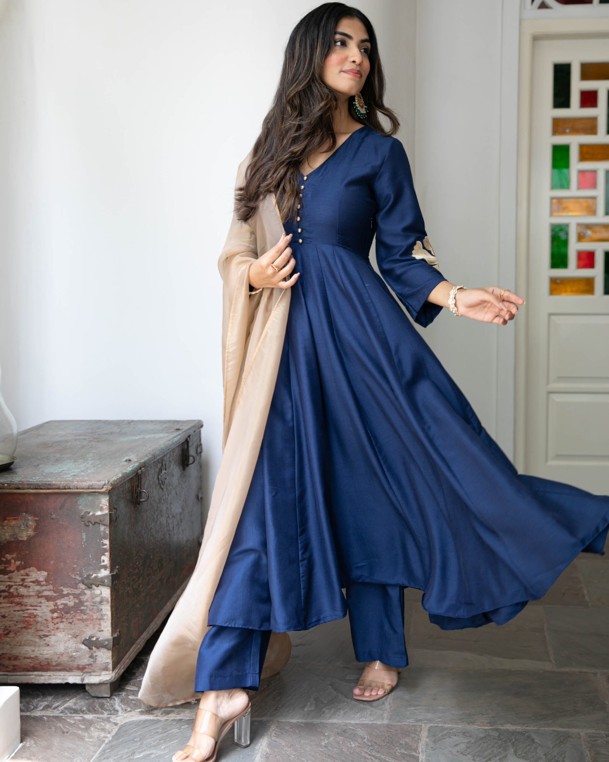 Embrace classic elegance with the Reeva Suit Set in rich navy blue cotton silk. This flared suit features a flattering V-neckline, three-quarter sleeves with intricate patchwork, and charming buttons on the yoke. Paired with matching pants and a contrasting beige dupatta, it?s the perfect blend of sophistication and style for festive gatherings and special occasions.