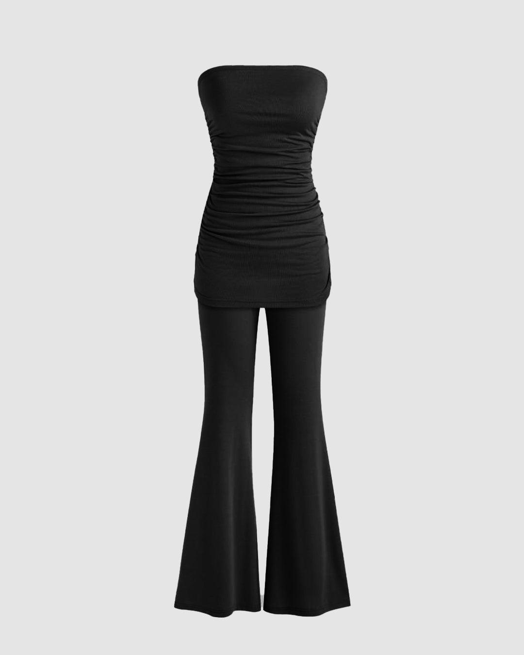 Ribbed Tube Ruched Top and Flare Pants in Black