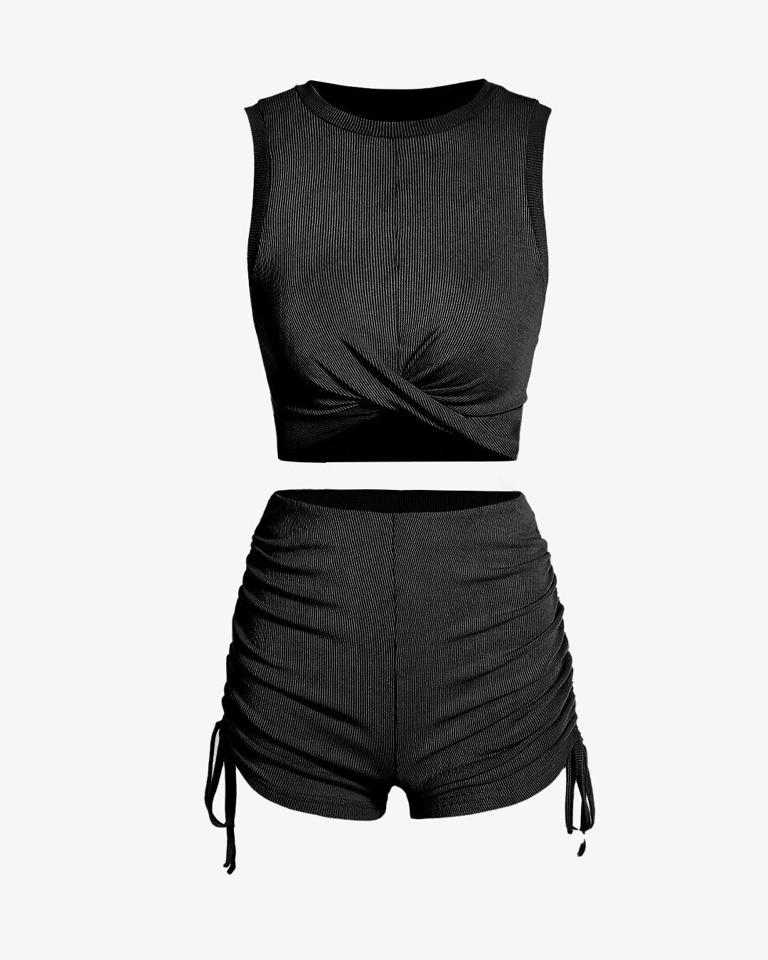 Ribbed Twisted Racerback Crop Tank Top with Cinched Side Shorts Set in Black