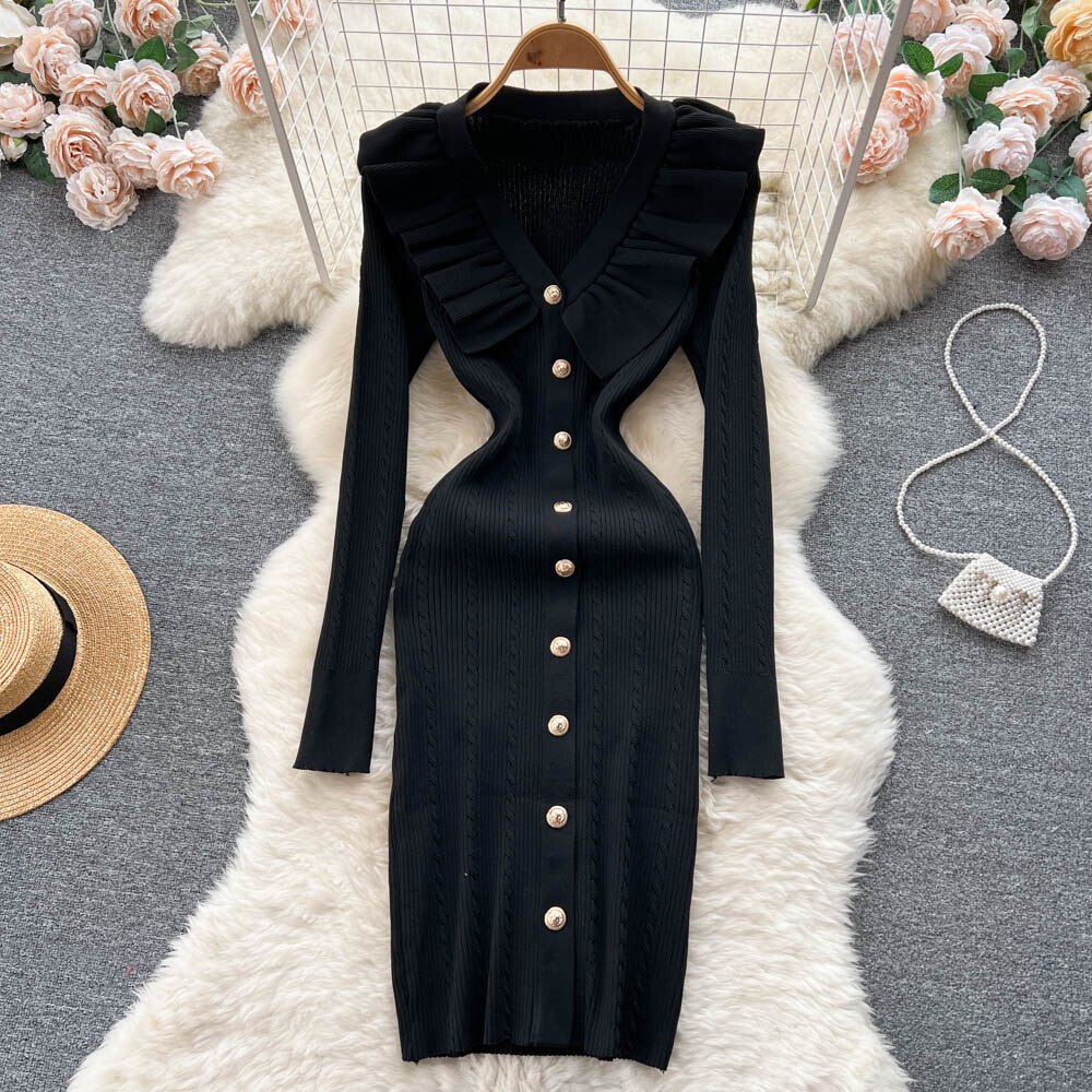 Sleeve Length: FullSilhouette: SheathPattern Type: SolidNeckline: V-NeckMaterial: Cotton, PolyesterFit Type: Slim FitFabric Type: KnittingElasticity: High StretchDresses Length: Knee-LengthDecoration:?RufflesClosure Type: Pullover