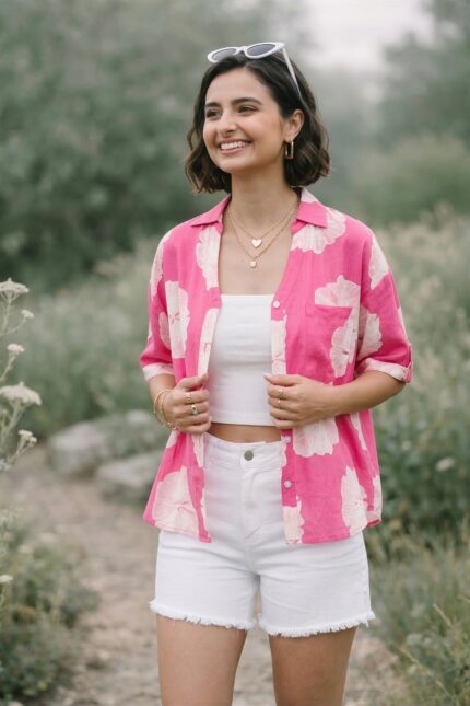 Pink Floral Cotton Summer Shirt for Women Casual Wear