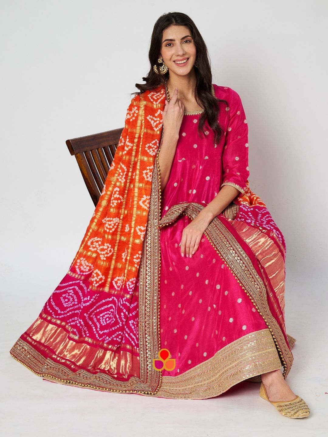 Home Suit Set Rose Pink Silk Anarkali With Pants and Pink Orange Silk Gharchola Dupatta