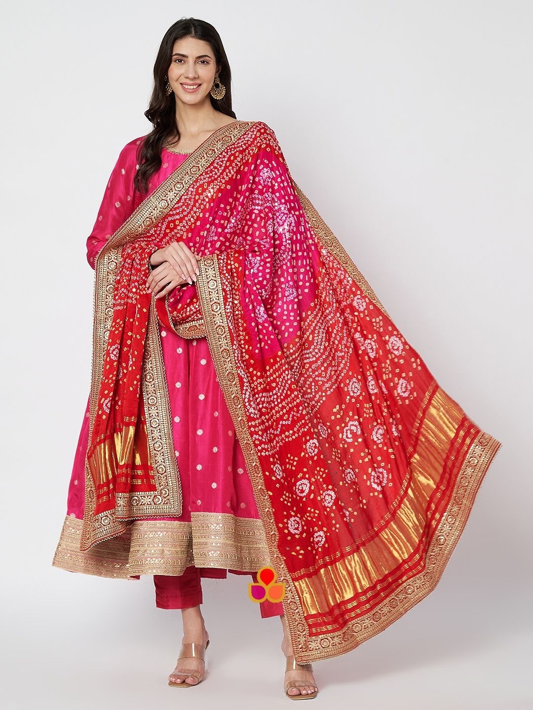 Rose Pink Silk Anarkali with Straight Pants and Red & Pink Silk Bandhani Mukaish Dupatta