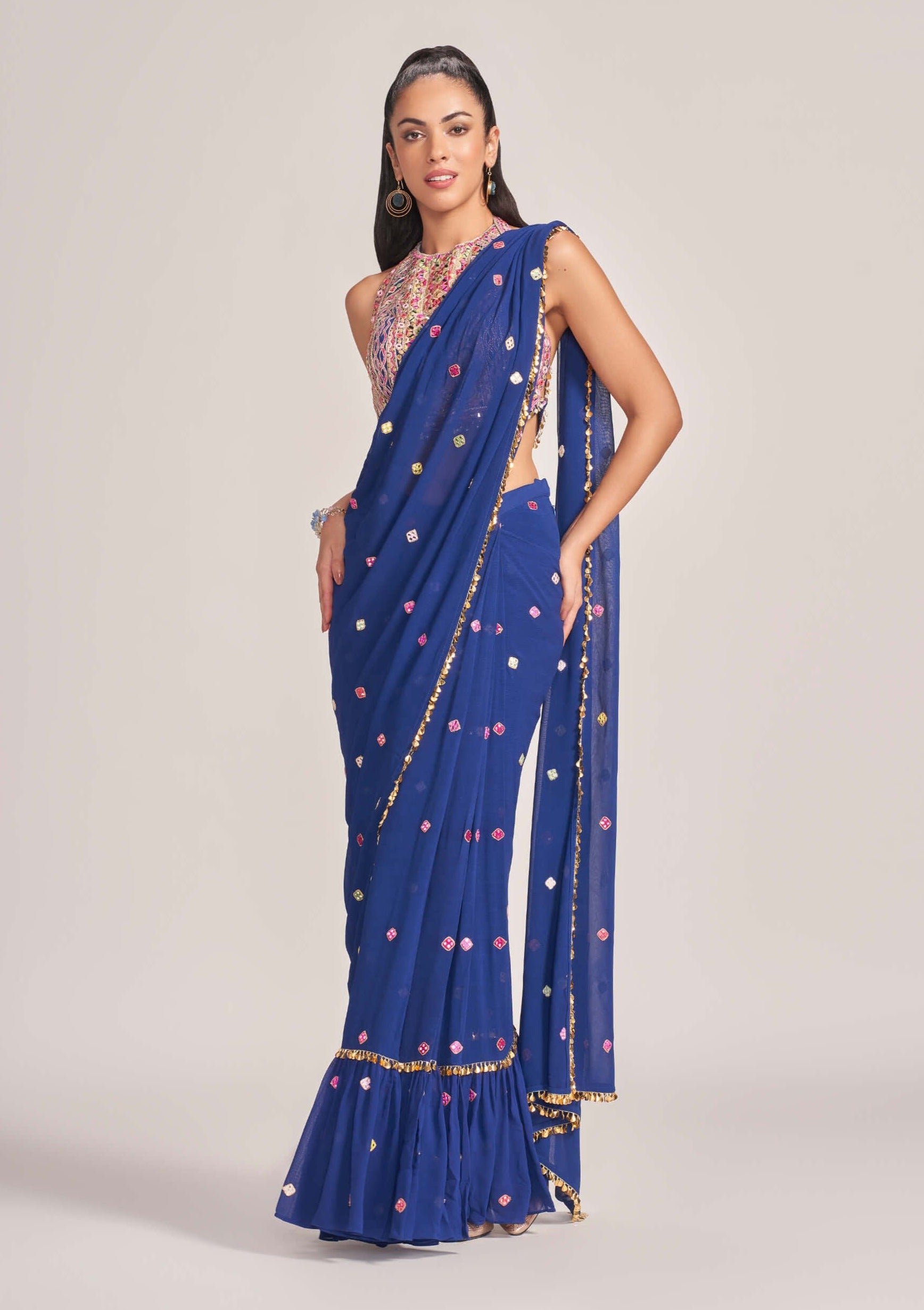 Royal Blue Ruffle Draped Saree with Blouse for Women Party Wear