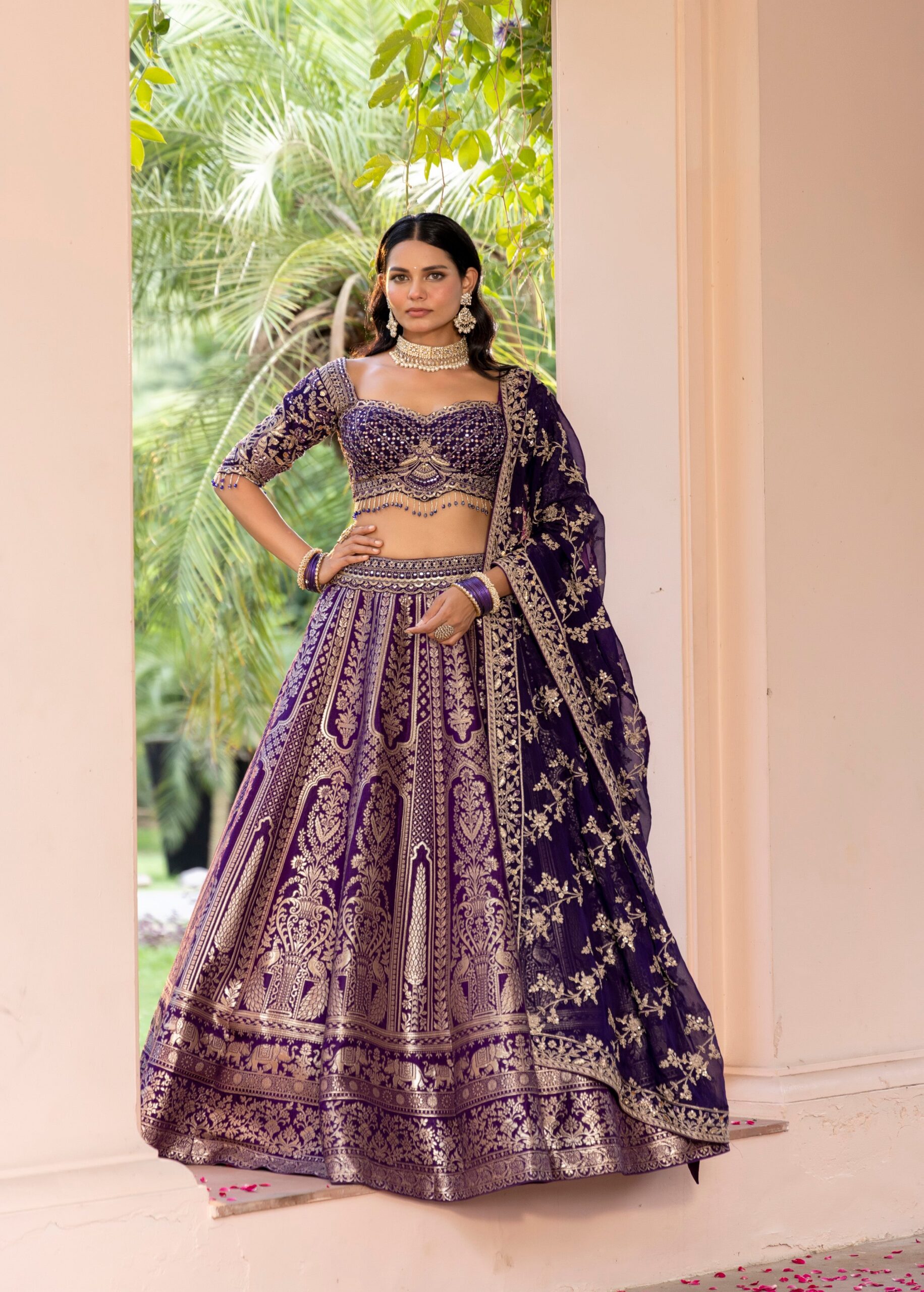 This regal three-piece set is crafted from premium Royal Purple Banarasi silk, designed for timeless festive elegance. The ensemble features a voluminous lehenga and matching blouse lavishly detailed with golden dori, sequins, and intricate handwork including stones, zarkan, and mirrors. A coordinating dupatta with a heavy embroidered border completes this sophisticated, luxurious look.
