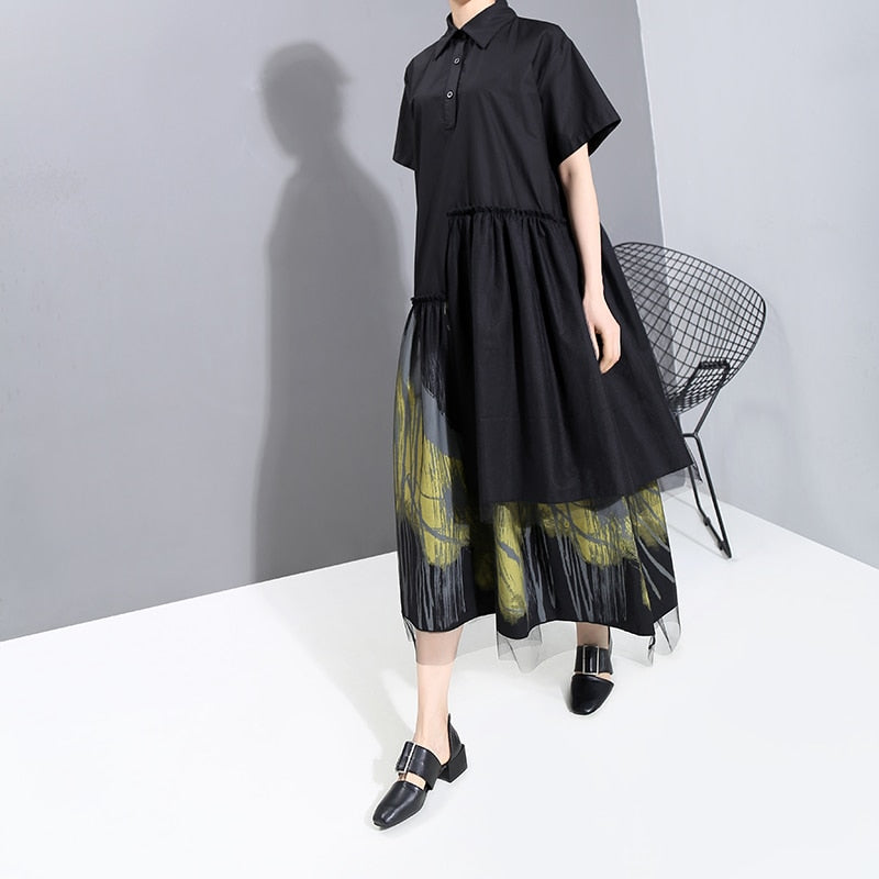 Short-Sleeved Midi Dress with Patchwork Style, Turn Down Collar, Abstract Print Pattern, and Cotton Rayon Material