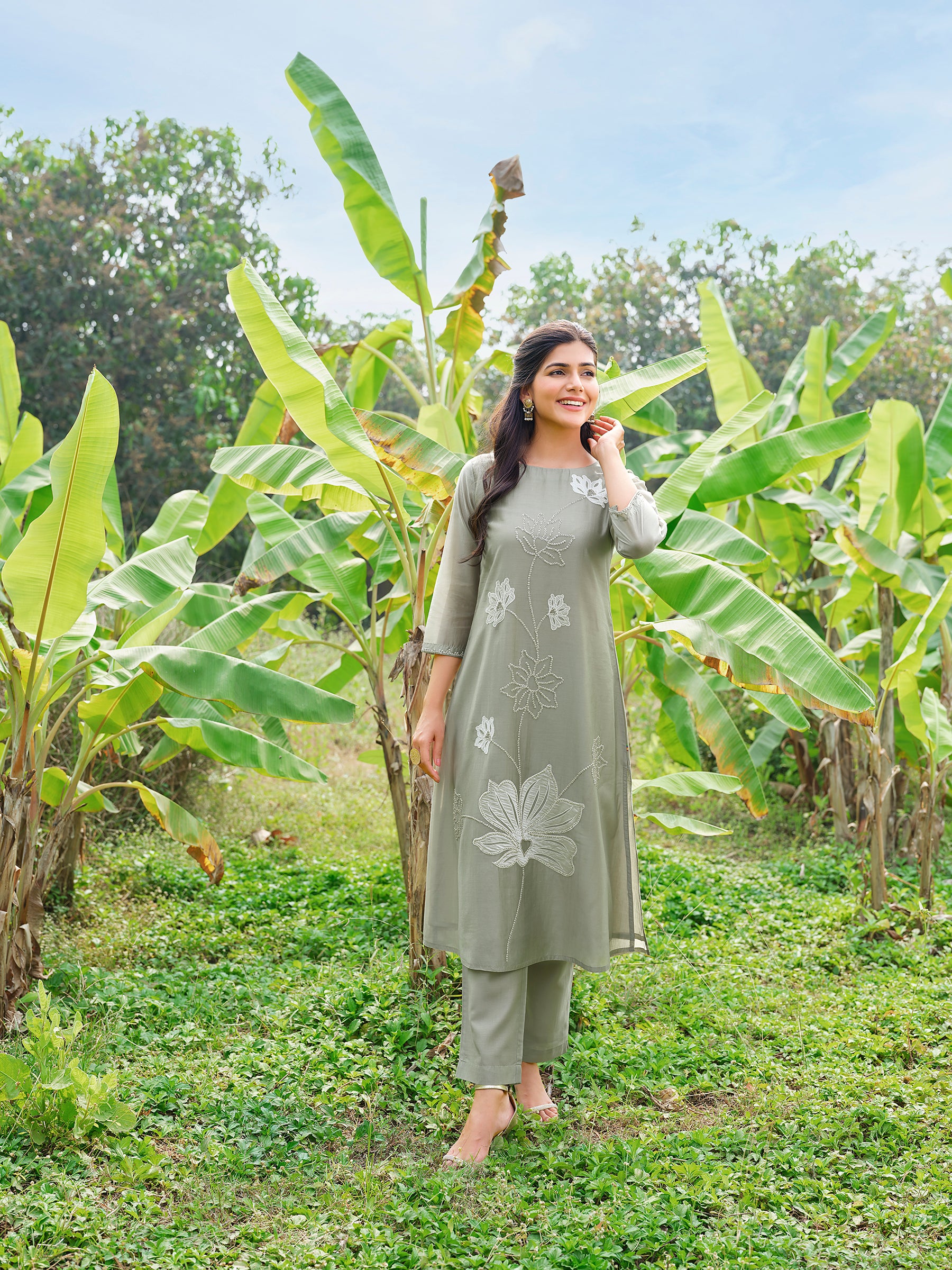 Embrace understated elegance with this soothing sage green Chanderi silk kurta set, beautifully highlighted by bold, winding floral embroidery.