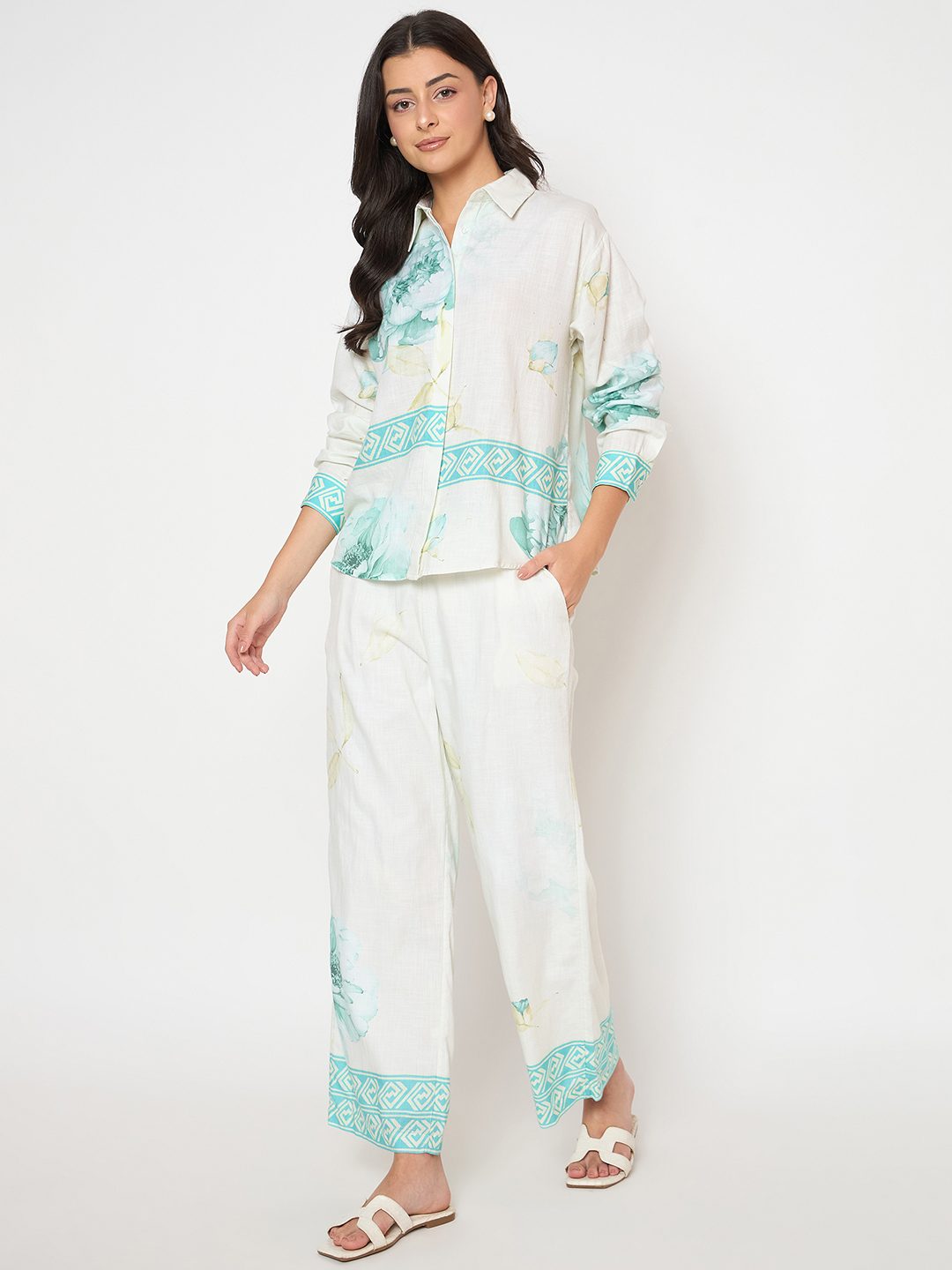 This sea green co-ord set features a floral print top and bottoms for a fresh, coordinated look. Perfect for daytime outings or weekend getaways. Just add sandals!