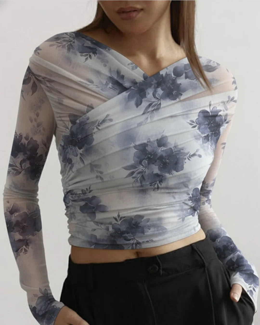 The Sheer Mesh Long Sleeve Ruched Wrap Top brings a bold, soft-focus vibe with its fitted shape and dreamy mesh texture. The ruched wrap detail adds natural definition, giving the Ruched Wrap Top a lifted and flattering look. The mesh fabric adds a light, breathable feel that sits comfortably on the skin, making it perfect for layering or wearing as a statement piece. The blended fabric mix keeps it stretchy and easy to move in, while the wrap style adds subtle structure.This Ruched Wrap Top works effortlessly for casual plans, brunch meetups, or evening outings. It pairs well with denim, skirts, or wide-leg pants for an easy, day-to-night switch. The fit feels soft, flexible, and comfortable for long wear, making it a standout pick for simple but statement styling.Why this productSoft mesh fabric that feels light and breathableRuched details that add definition without effortEasy to pair for both casual and dressy moods