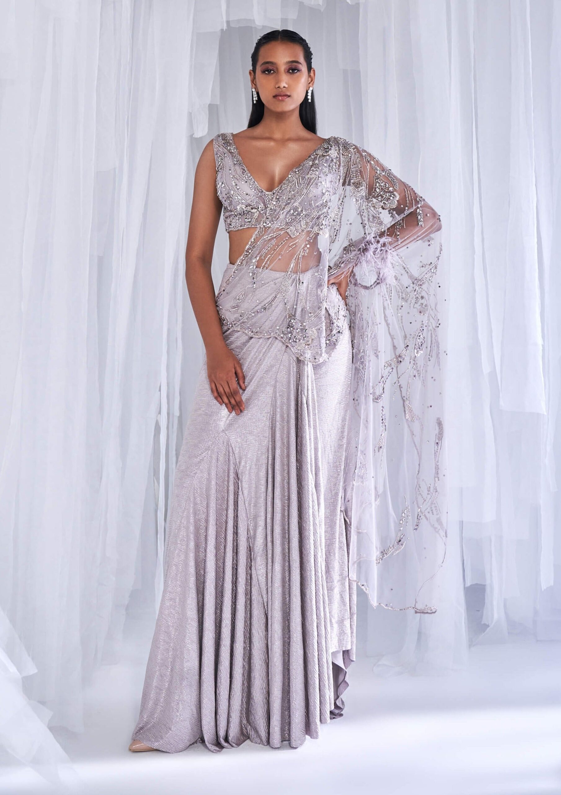 Be the first to review “Silver Designer Draped Saree Gown Style Set for Women” Cancel reply