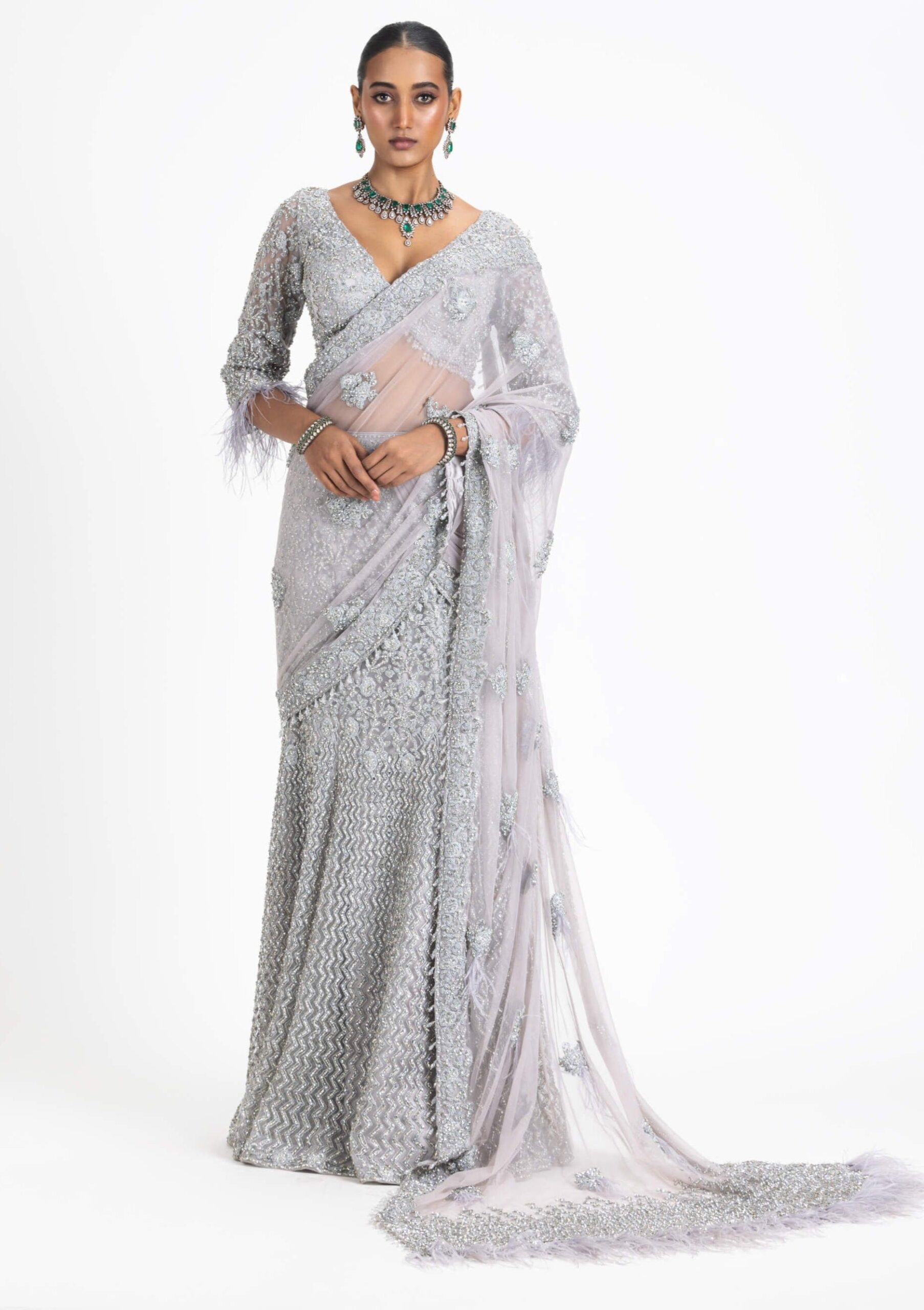 Elevate your style with our silver grey fishtailed skirt Saree. This ensemble includes a 3/4 sleeve blouse and a net palla that’s intricately embroidered with silver zari, dabka, beads, and crystals. The feathers on the blouse sleeves add a touch of elegance and flair. Make a statement at your special occasion with this exquisite outfit.