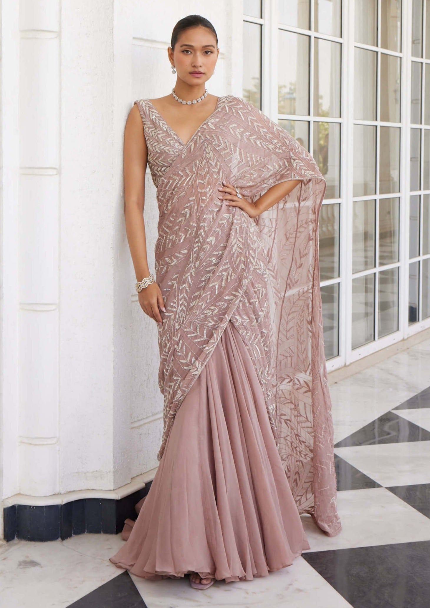Pink Crepe Saree with Hand Embroidered Cape | Designer Wedding Wear