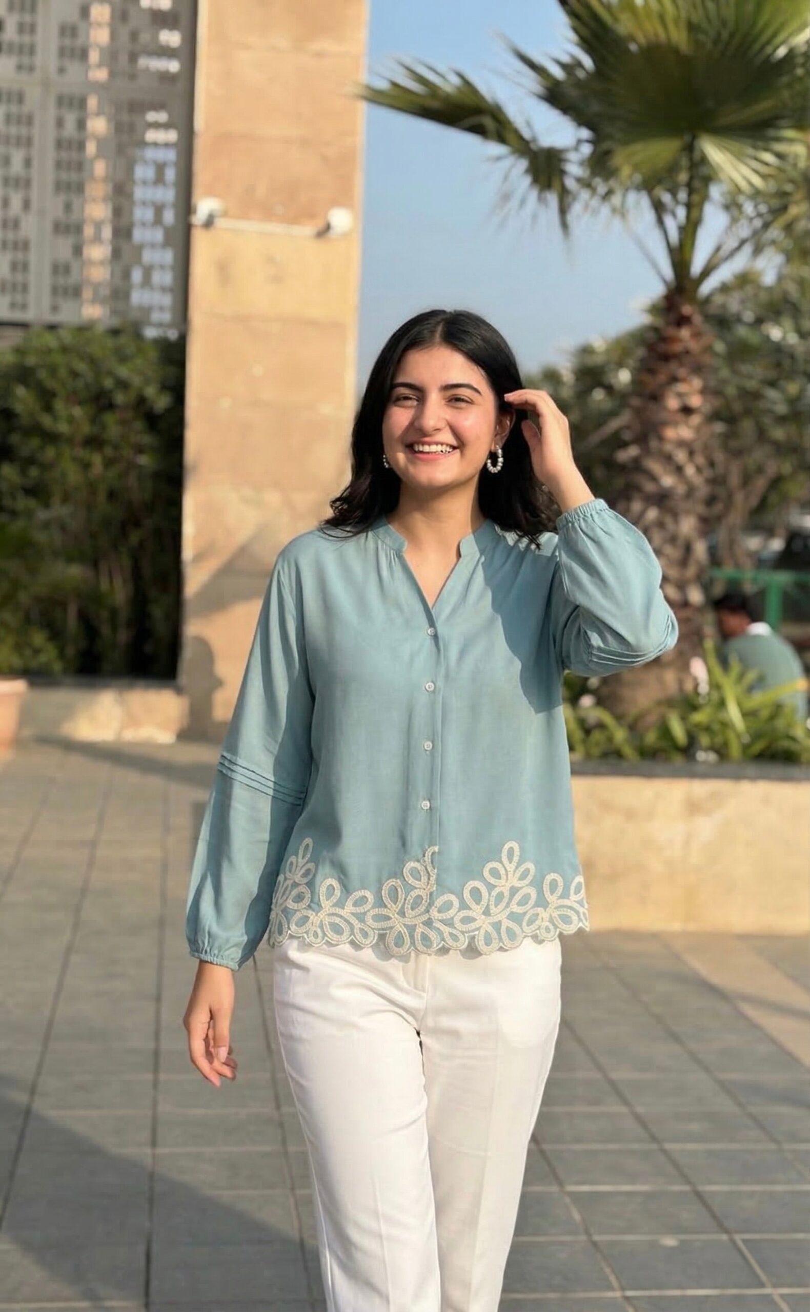 Sky Blue Embroidered Rayon Shirt for Women Full Sleeve